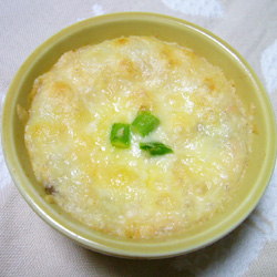 4. 3)のマッシュポテトの中に、2)のゆでた鮭をほぐし入れ、耐熱性の器に入れて上にチーズを載せ、オーブントースターでチーズが溶けるまで焼く。