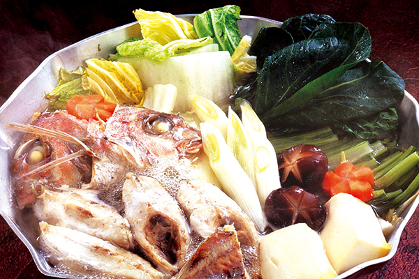3. 鍋に水、酒、昆布を入れ沸騰してきたら昆布をとり出し、3)のタイを入れる。アクをすくい他の材料も加え、【薬味】を入れたポン酢醤油をつけていただく。