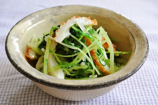 2. 水菜、ちくわを塩麹で和える。仕上げに薄口しょうゆで味を調える。