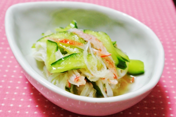 1. きゅうりは縦半分に切り、斜め薄切りにし、塩もみをする。