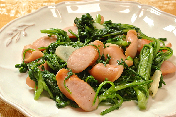 春菊とソーセージのガーリックソテー
