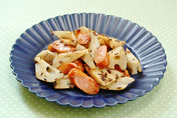 1. れんこんは皮をむいて食べやすい大きさに乱切りにする。ウインナーは斜め切りにする。
