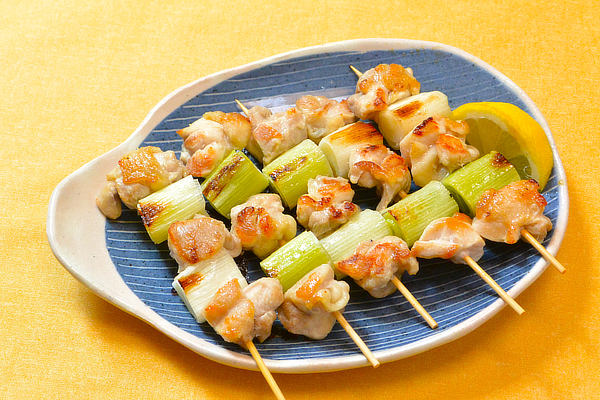 2. 竹串に鶏肉3切れと長ねぎ2切れを交互に刺す。これを6本作り、塩を振る。