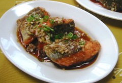 サーモン(生) 塩、こしょう 酒 白ねぎ 片栗粉 揚げ油 【タレ】 豆板醤 酢 砂糖 しょうゆ ごま油 青ねぎ
