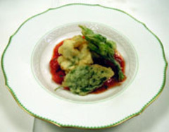 白身魚 スカンピ タケノコ(厚めのスライス) 卵白 塩 胡椒 大葉またはその他のハーブ(粗みじん切り) ー衣ー 炭酸水 塩 砂糖 薄力粉 ーソースー トマト(小)(湯剥き) 塩 胡椒 バジル(みじん切り) エキストラ・ヴァージン・オリーブオイル 揚げ油(ピュア・オリーブオイル)